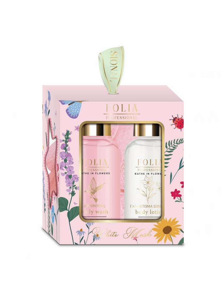 Folia Square Box White Musk – γυναίκειο σετ δώρου που περιλαμβάνει 100ml Body Lotion, 100ml Shower Wash και 1 Σφουγγάρι.
